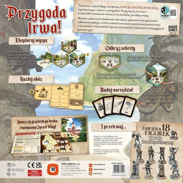 Robinson Crusoe: Przygoda na Przeklętej Wyspie - bestsellerowa gra kooperacyjna dla 1 do 4 graczy autorstwa Ignacego Trzewiczka. Edycja Kolekcjonerska to wyjątkowe wydanie rozbudowujące klasyczną wersję o Kampanię Wprowadzającą, która krok po kroku uczy zasad gry, zestaw 18 wysokiej jakości figurek i plastikową wypraskę w nowym, powiększonym pudełku, mieszczącym wszystkie komponenty.
