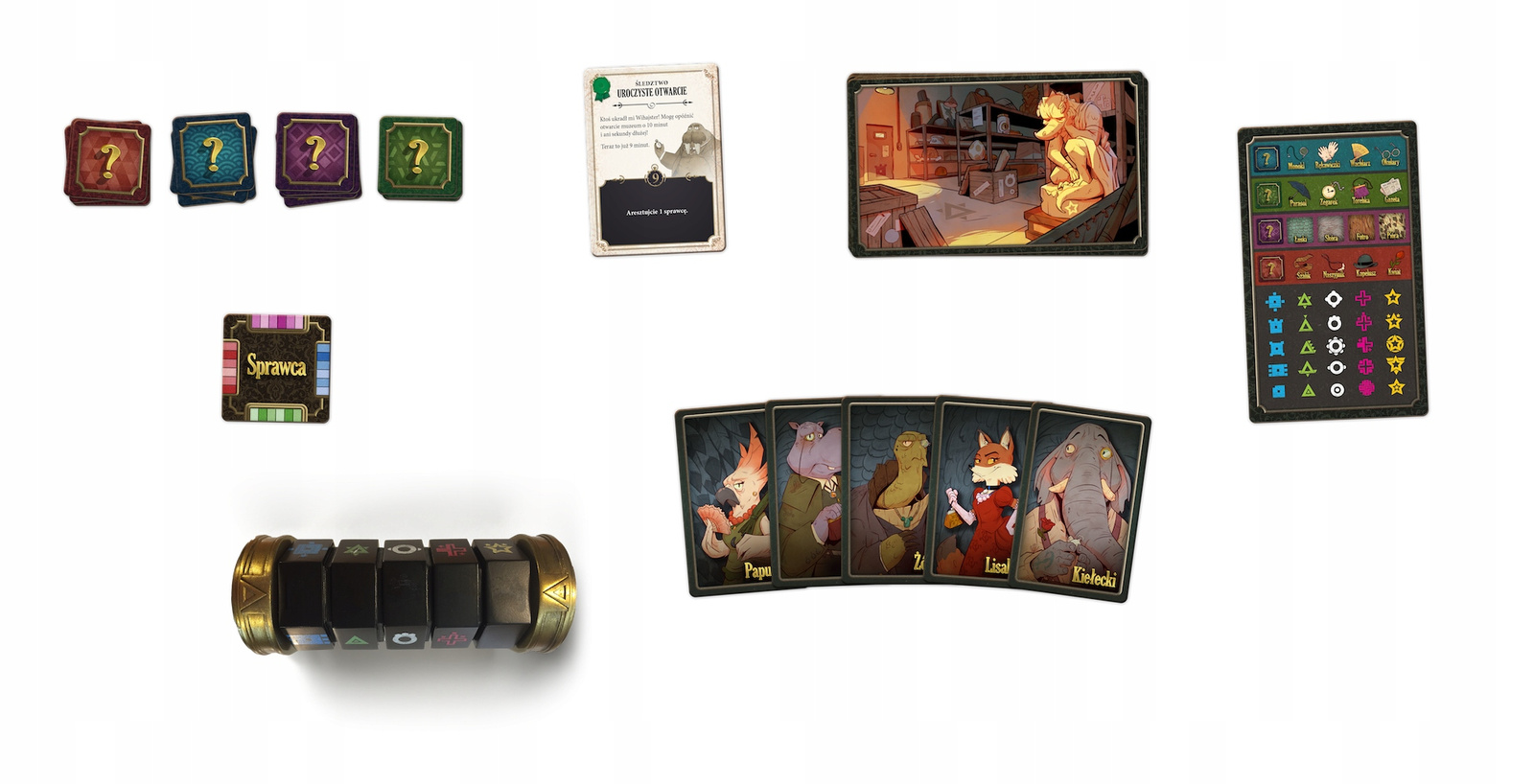 - Wskazówki to atrybuty podejrzanych, które pozwolą nam eliminować kolejne karty z ręki. Na każdym kafelku wskazówki i z tyłu kafelków sprawcy znajdują się kolorowe paski, które porównujemy. Jeśli są identyczne, nasz sprawca ma tę rzecz lub cechę, natomiast jeśli się różnią – nie posiada jej. Na tej podstawie odrzucacie niepasujące karty ze swojej ręki.